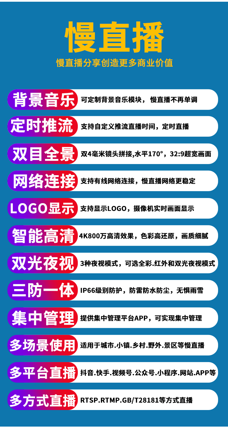 - 1、800万双目拼接双光枪式慢直播摄像机,1个摄像机就是一套慢直播系统;双目拼接180度超广角;