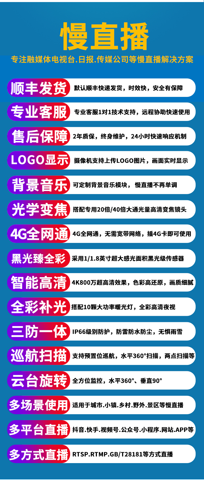 2、内置智能4G模块,没有宽带网络的地方也能实现实时慢直播;