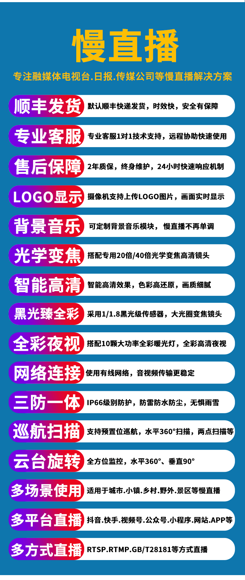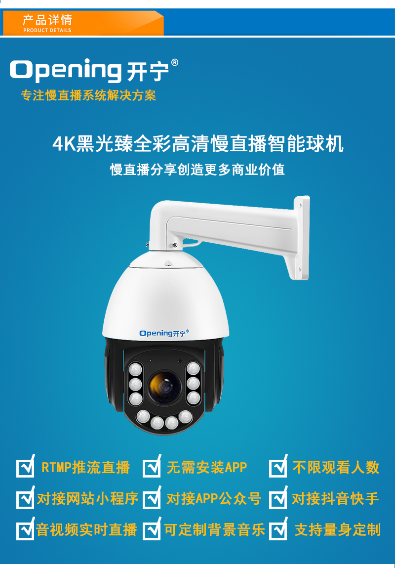 - 1、4K800万6寸20倍全彩慢直播智能高清球机,一个球机就是一套慢直播系统;支持360度旋转,支持预置点和巡航,20倍光学变焦,半金属外观,IP66防水等级;