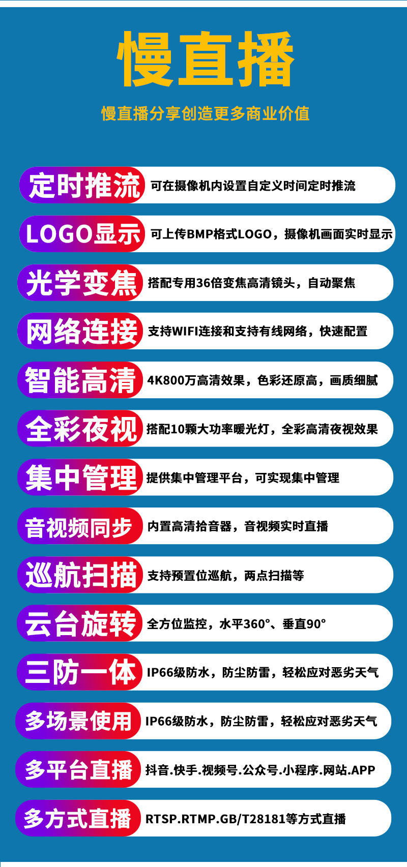 - 1、4K800万6寸WIFI全彩慢直播智能高清球机,一个球机就是一套慢直播系统;支持360度旋转,支持预置点和巡航,20倍光学变焦,半金属外观,IP66防水等级;